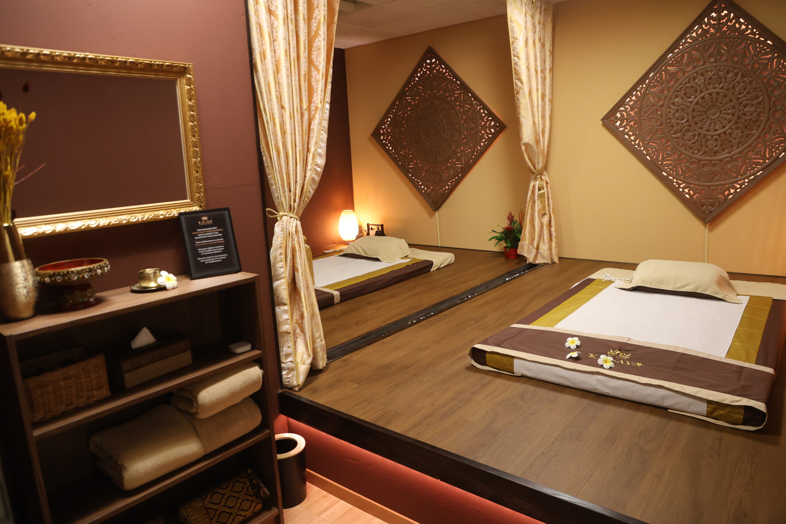 Dès votre arrivée, laissez-vous transporter par la sérénité des lieux : un accueil chaleureux, une ambiance apaisante, 6 espaces de massage soigneusement aménagés et une musique relaxante pour un voyage sensoriel unique.